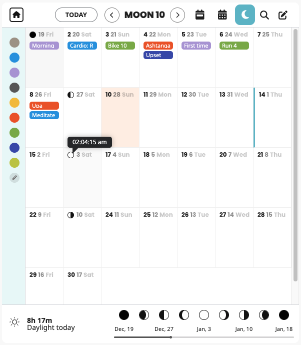 This view is ideal for those who prefer to plan, reflect, and reset in harmony with nature’s cycles rather than purely linear time. Learn how to use moon cycle in your life →